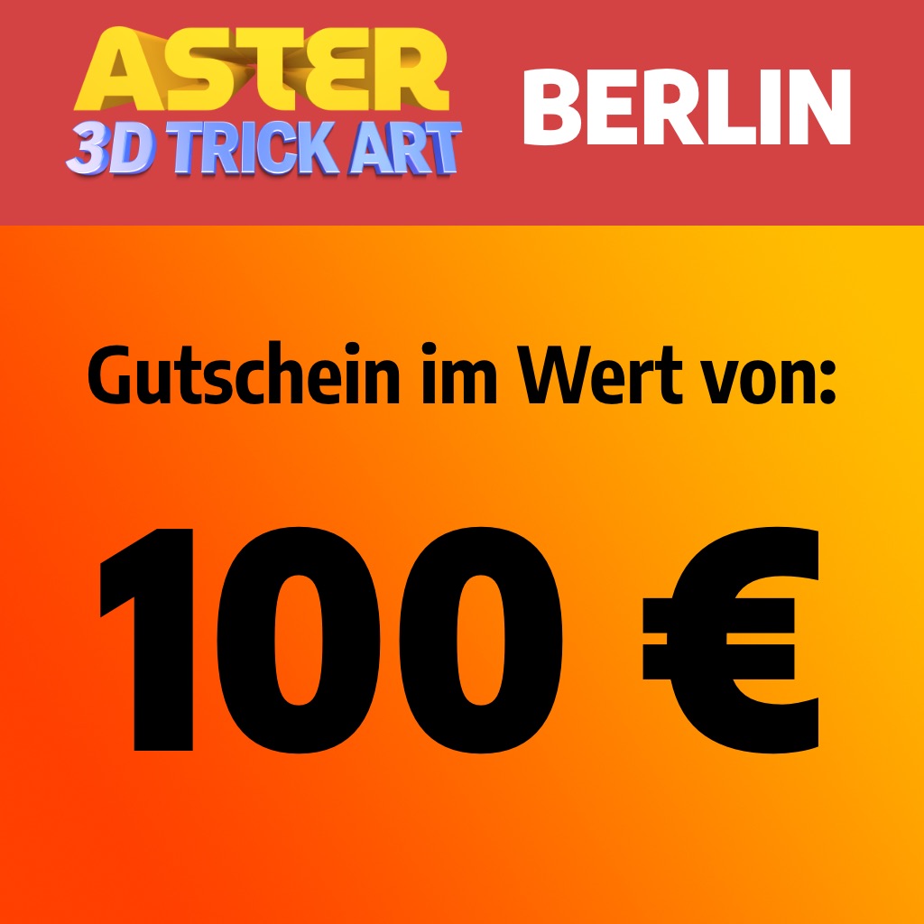 Dieser Gutschein im Wert von 100 € kann 3 Jahre nach Kaufdatum im 3D TrickArt Museum Berlin eingelöst werden. Eine Barauszahlung ist nicht möglich. Keine Verlängerung möglich.